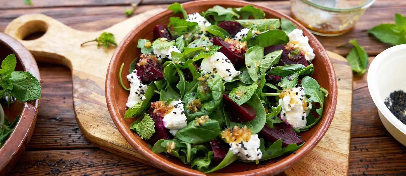 Die Rote Bete in Spalten schneiden und auf einem Teller anrichten. Ricotta in kleine Stücke zerteilen und daraufgeben, dann Rucola und Spinat darauf verteilen. Mit dem Dressing beträufeln, mit Minzblättchen garnieren und mit Sesam bestreuen.
