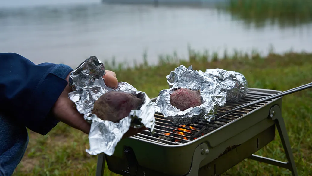 Rote Bete waschen, in Alufolie wickeln und 45–50 Minuten auf dem Grill oder im Backofen bei 180–200 °C garen, bis sie weich ist.