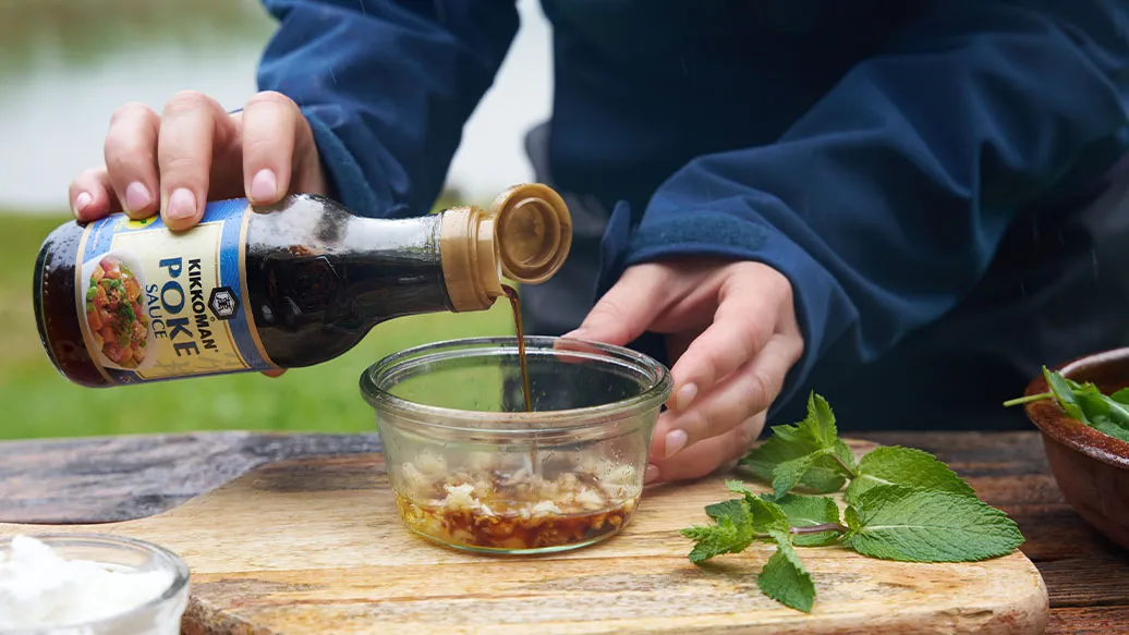 Ingwer und Knoblauch fein hacken, dann mit Kikkoman Sauce für Poke Bowls und Honig zu einem Dressing vermengen.