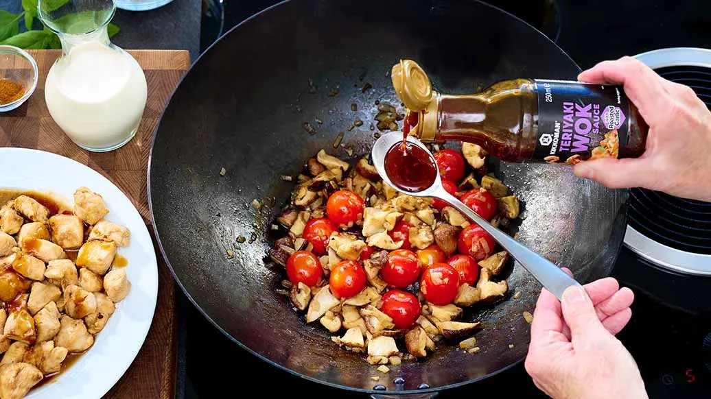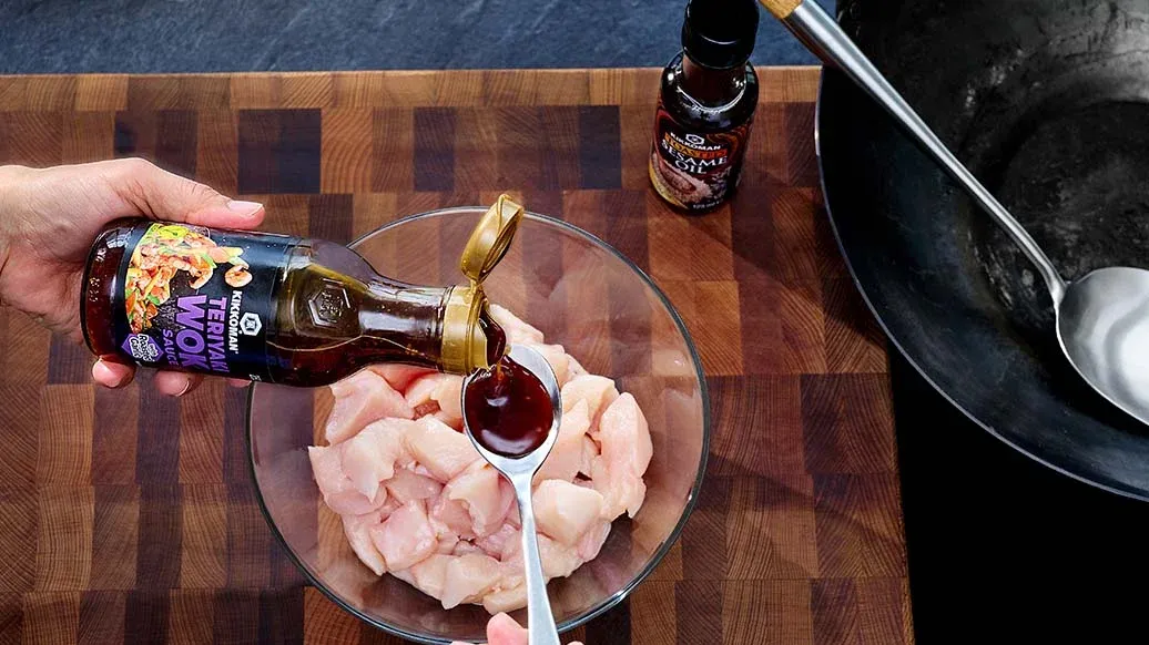 500 g Hühnerbrustfilet – 4 EL Kikkoman Teriyaki Wok Sauce mit geröstetem Knoblauch – 1 EL Kikkoman geröstetes Sesamöl