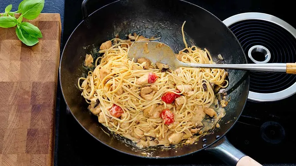 Diese ultimative Fusion-Pasta vereint cremige Alfredo-Sauce mit würzig-süßer Kikkoman Teriyaki Sauce mit Knoblauch – zartes Hühnerfleisch und frisches Gemüse, schnell zubereitet und mit aufregendem Umami-Kick!