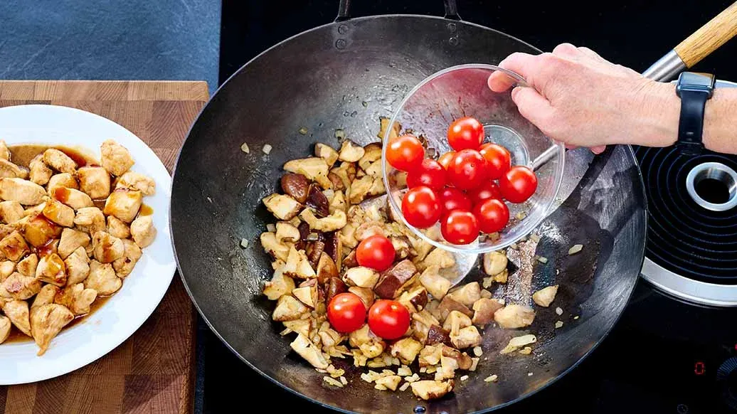 Butter im selben Wok erhitzen. Pilze in ca. 2 cm große Stücke schneiden. Zwiebel würfeln, Knoblauch fein hacken und beides mit den Pilzen in der erhitzten Butter ca. 5 Min. dünsten. Tomaten zufügen und ca. 3 Min. mitdünsten.