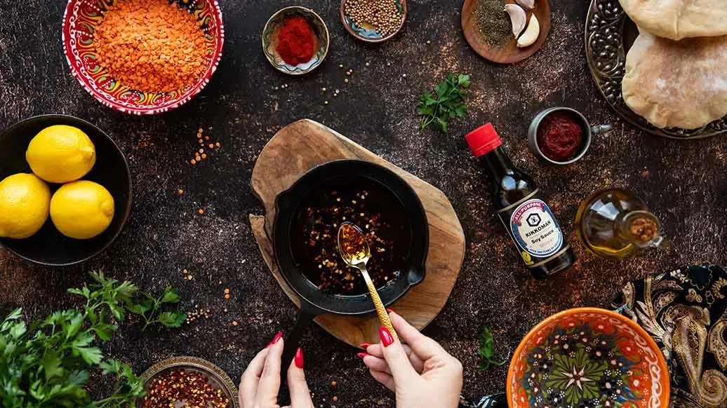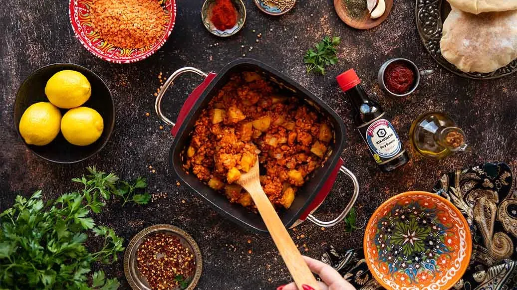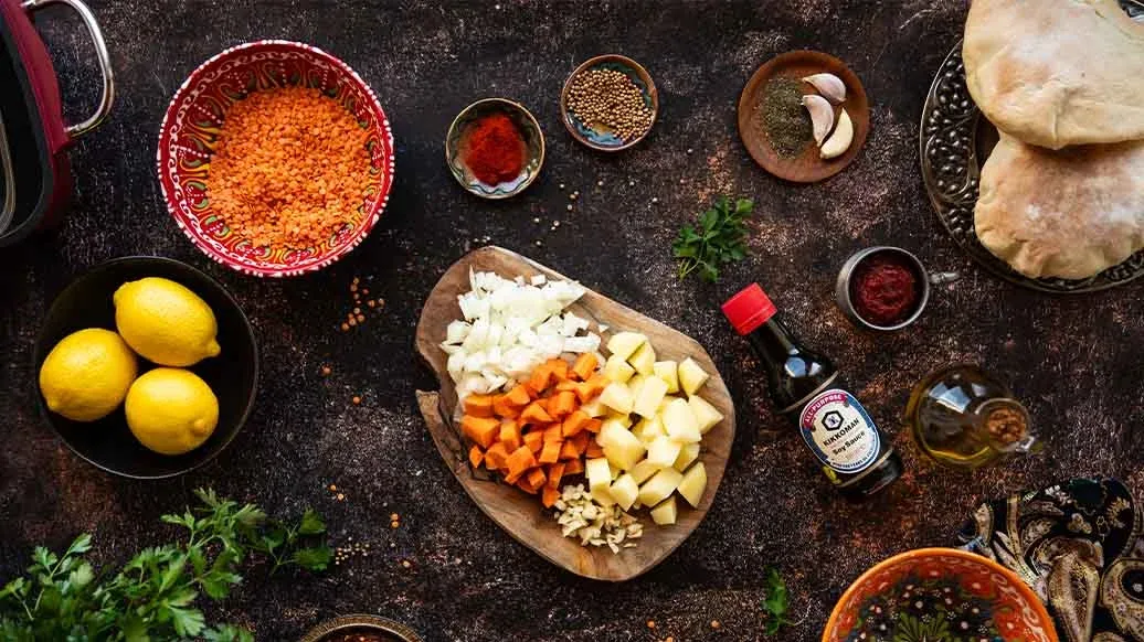 Eine wohltuende Suppe aus roten Linsen, Karotten und Kartoffeln, aromatisiert mit Knoblauch, Gewürzen und Tomatenmark. Kikkoman Sojasauce sorgt für viel Umami, während Minze, Petersilie, Chili und Zitrone lebendige Frische liefern.