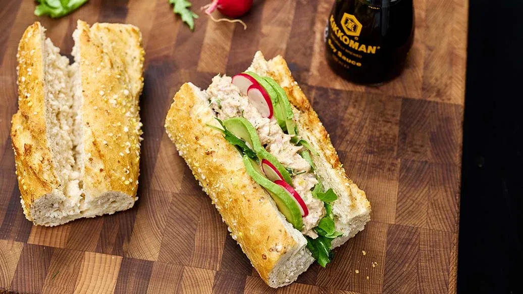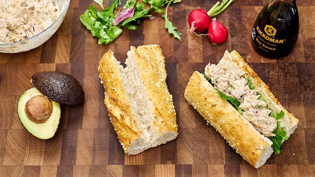 Kerniges Vollkornbrot mit cremigem Thunfisch-Salat, knackigem Blattsalat und frischer Avocado, verfeinert mit Kikkoman Sojasauce und griechischem Joghurt. Gesund und aromatisch durch viel Gemüse und den Asia-Twist mit Sojasauce-Wasabi-Creme.
