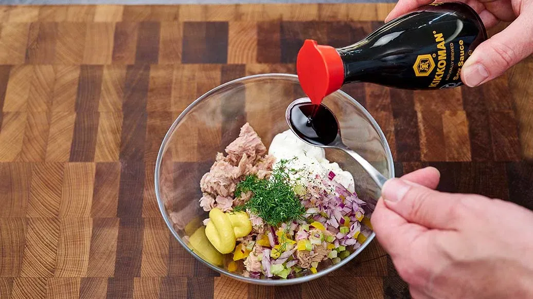 100 g abgetropfter Thunfisch (in Wasser) – 80 g griechischer Joghurt – 40 g gelbe Paprika in Würfeln – 1 TL rote Zwiebel in kleinen Würfeln – 20 g Staudensellerie in kleinen Würfeln – ½ TL Zitronensaft – 3 TL Kikkoman natürlich gebraute Sojasauce – 1 TL frischer gehackter Dill – ½ TL scharfer Senf – ¼ TL frisch gemahlener Pfeffer