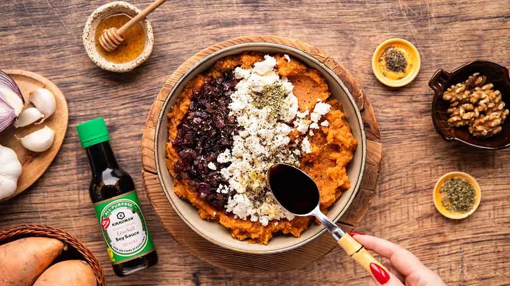 180 g rote Zwiebel – 3 EL Rapsöl – 2 TL Honig – 3 EL Kikkoman natürlich gebraute salzreduzierte Sojasauce – 350 g gekochte und gestampfte Süßkartoffeln – 100 g Feta-Käse, zerbröckelt – 1 Knoblauchzehe, gepresst – ½ TL frisch gemahlener schwarzer Pfeffer – ½ TL getrockneter Majoran – ½ TL getrockneter Thymian