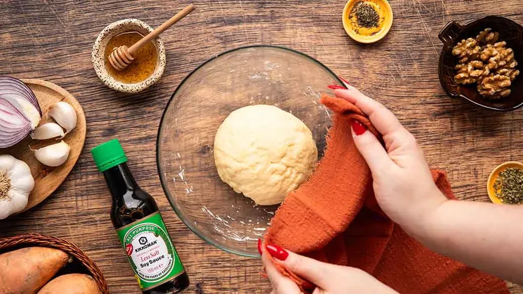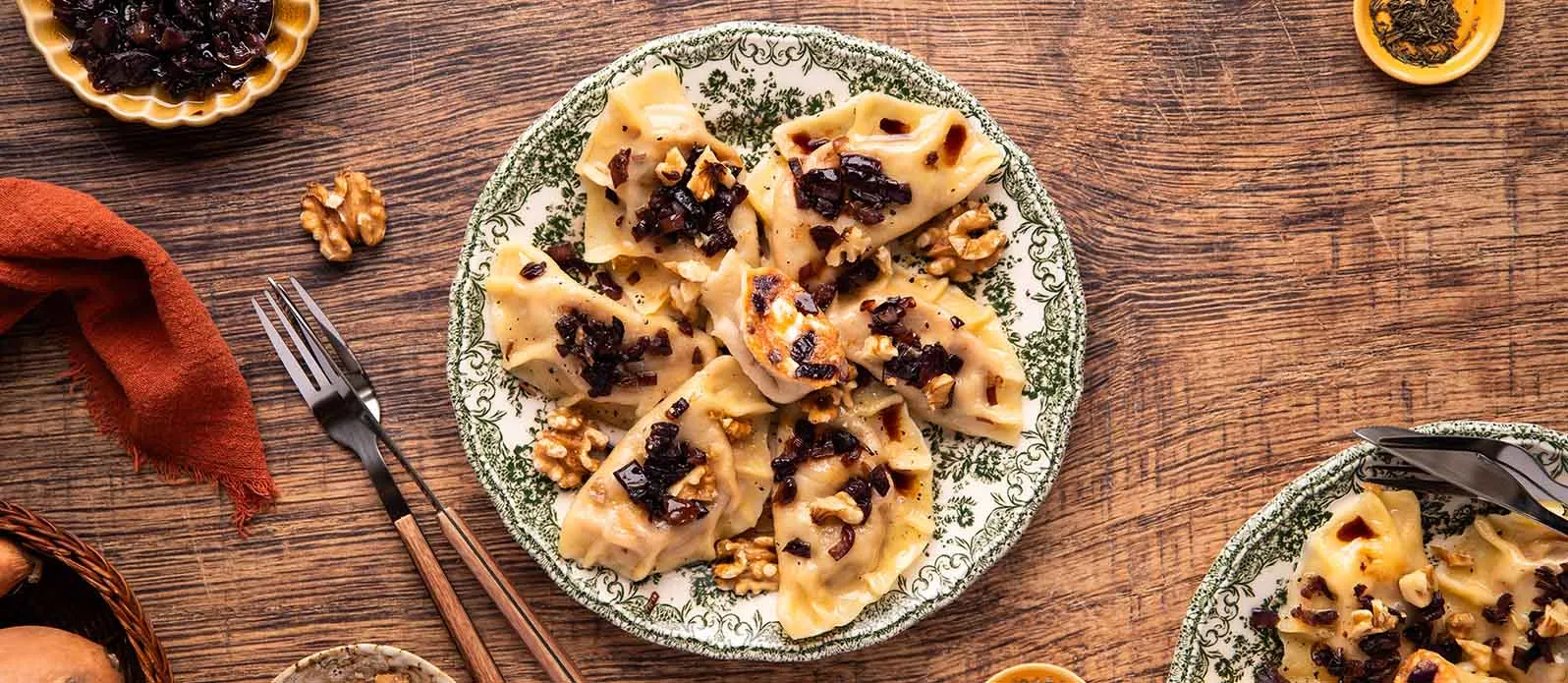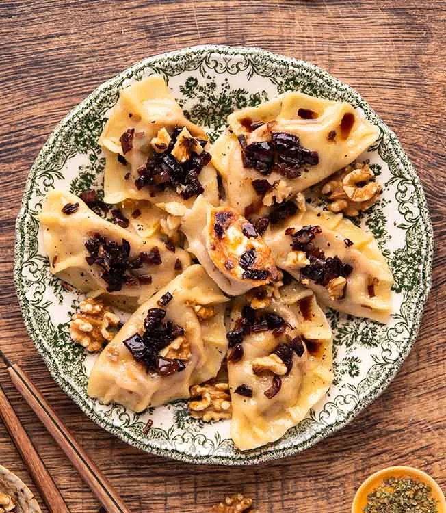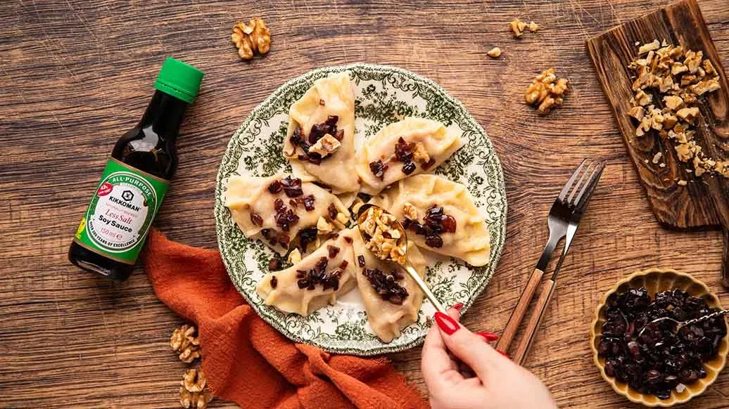 Polnische Teigtaschen gefüllt mit Süßkartoffeln, Feta und karamellisierten Zwiebeln. Ein Spritzer Kikkoman salzreduzierte Sojasauce sorgt für Umami-reiche Tiefe, gehackte Walnüsse für sanften Crunch – und alles zusammen für süß-herzhaften Genuss.
