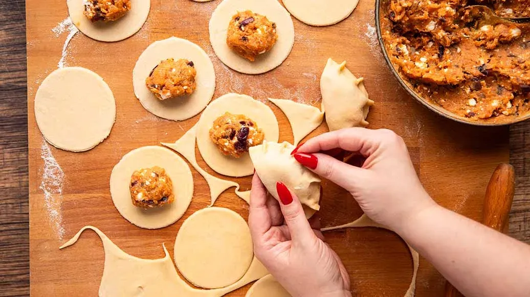 Den Teig ausrollen und mit einem Glas Kreise ausstechen. 1 EL Füllung in die Mitte geben, den Teig zu einem Halbmond falten und die Ränder zusammendrücken. Die Teigtaschen in kochendes Salzwasser geben, warten, bis sie an die Oberfläche steigen, und dann etwa 4 Minuten weitergaren.