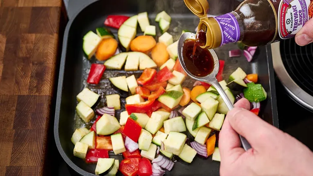 1 kleine Karotte – 1 kleine Zucchini – 1 rote Zwiebel – 1 kleine rote Paprika – 1 kleine Melanzani – 2 EL Olivenöl – 3 EL Kikkoman Teriyaki Sauce mit geröstetem Knoblauch – Pfeffer aus der Mühle