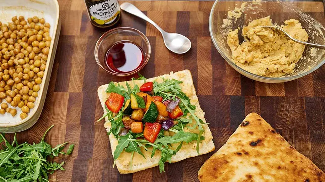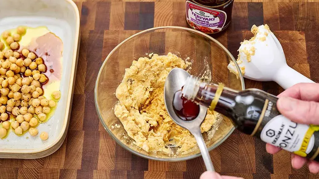 Den Backofen auf 200°C vorheizen. Für den Hummus die Kichererbsen abtropfen lassen und die Hälfte mit 2 EL Kikkoman Yuzu Ponzu und 2 EL Wasser pürieren. Die übrigen Kichererbsen in eine kleine Auflaufform geben, mit dem Leinöl, etwas Pfeffer und 1 EL Kikkoman Teriyaki Sauce mit Knoblauch vermischen und im vorgeheizten Backofen ca. 15 Minuten rösten.