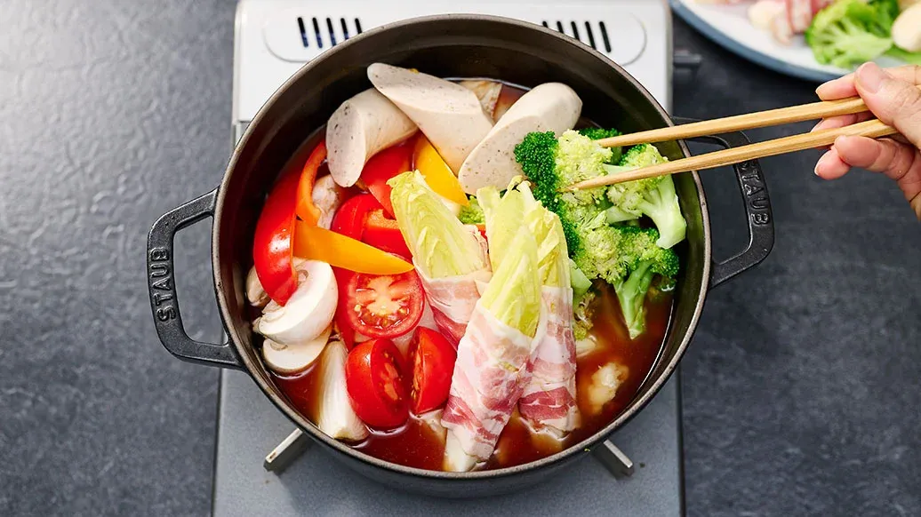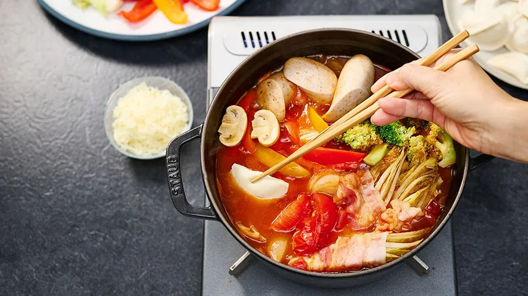 Dieser Eintopf aus gängigen europäischen Zutaten besticht durch die Säure der Tomaten und die Schärfe von Kikkoman Chilisauce Kimchi. Räucherspeck, Würstchen und Käse sorgen für viel Umami. Schnell am Tisch zubereitet und ideal zum Teilen.