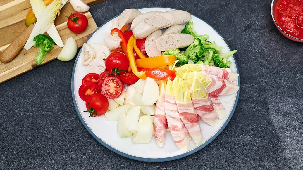 Chicorée längs vierteln und jedes Stück mit einer Speckscheibe umwickeln. Brokkoli in mundgerechte Röschen zerteilen. Zwiebel und Tomaten in je 8 Spalten, rote Paprika längs in Streifen schneiden. Pilze putzen, größere Pilze (Champignons oder Austernpilze) halbieren und Enoki-Pilze in Büschel teilen. Die Würstchen halbieren.