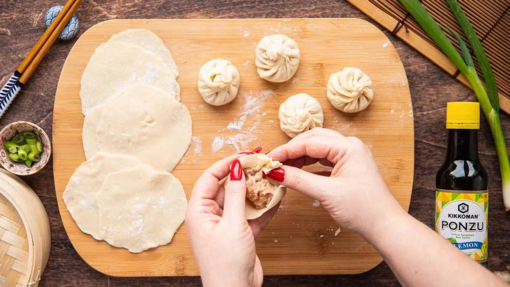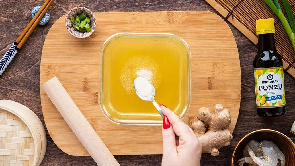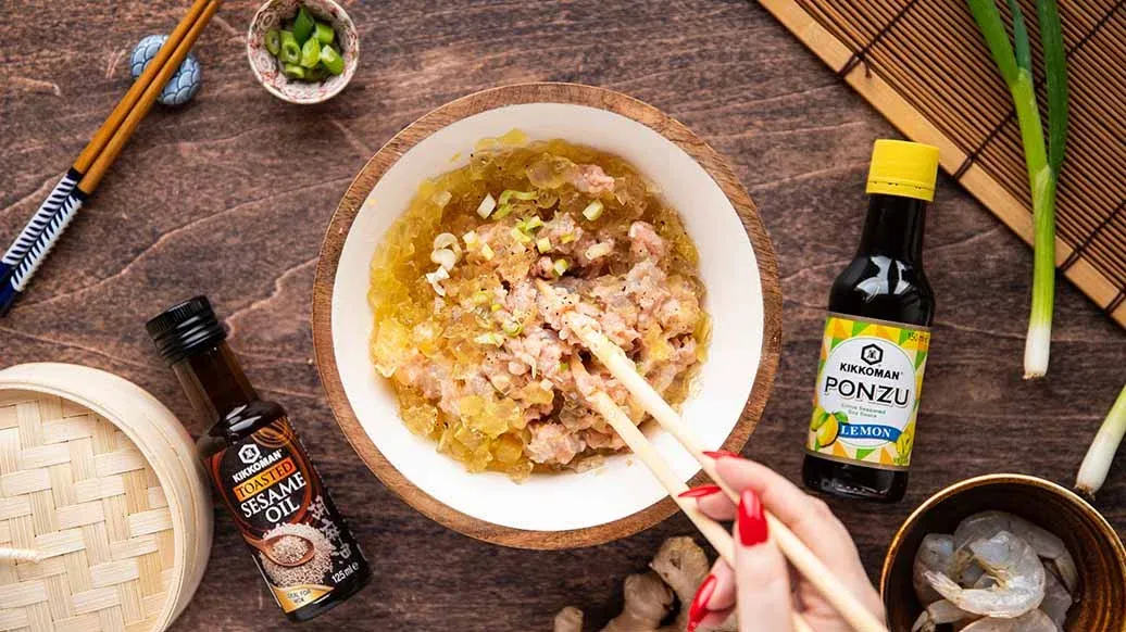 Hühnerfleisch, Garnelen, Frühlingszwiebel, Ingwer, Kikkoman Ponzu Zitrone, Kikkoman Sesamöl, Zucker und Pfeffer in einer Schüssel vermengen. Wenn die Brühe fest geworden ist, in kleine Würfel schneiden und vorsichtig unter die Füllung mischen.