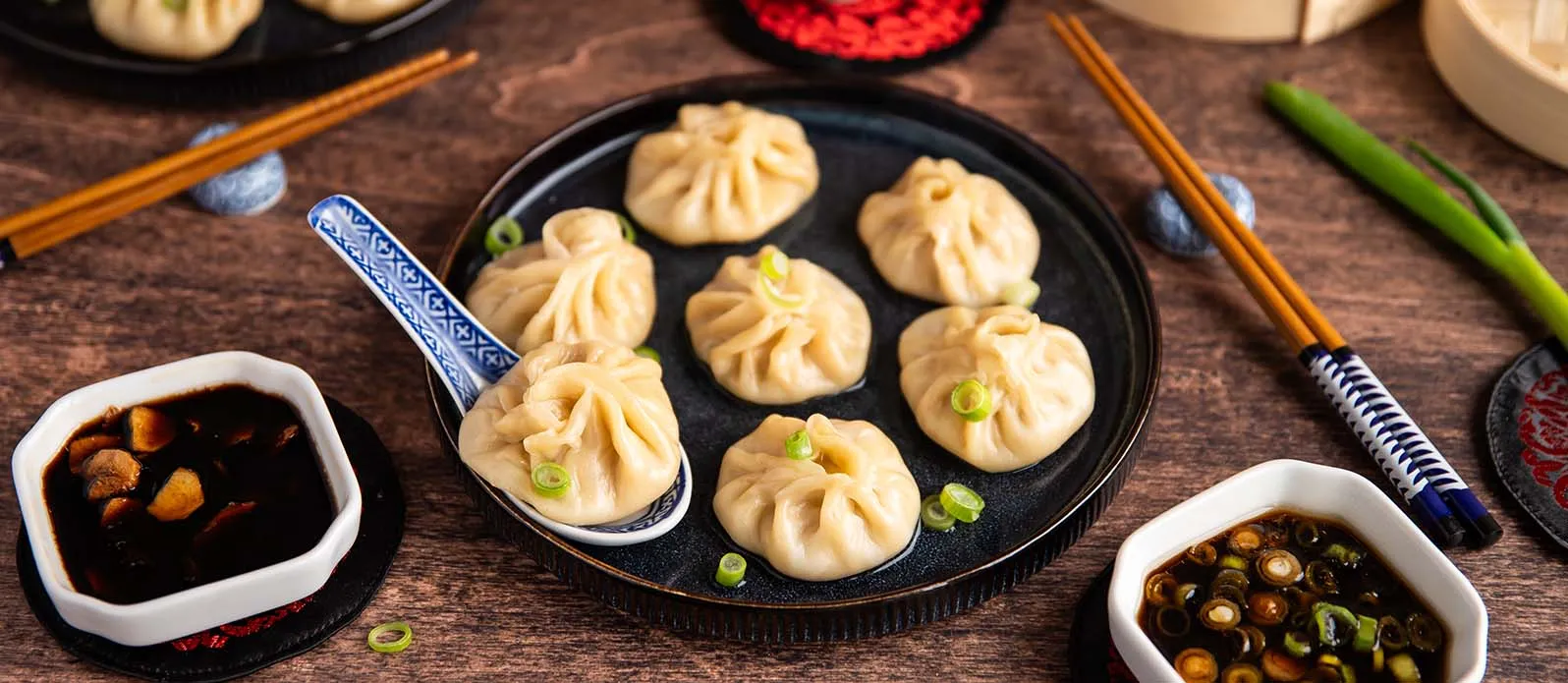 Delikate chinesische Teigtaschen, gefüllt mit Hühnerfleisch, Garnelen und heißer Brühe. Sie werden mit zwei Dips auf Sojabasis serviert. Dieses herzhafte Gericht bietet einen intensiven Umami-Geschmack – einfach pure Wohlfühlküche!