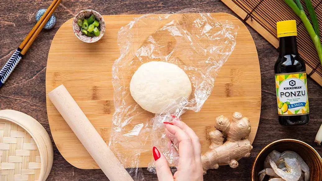 Mehl und heißes Wasser in einer Schüssel mit Stäbchen oder einer Gabel vermengen, bis ein glatter, elastischer Teig entsteht. In Frischhaltefolie einwickeln und ruhen lassen. In der Zwischenzeit die restlichen Zutaten vorbereiten.