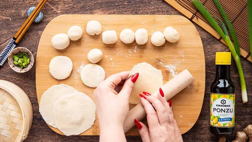 Für die Teigtaschen können auch fertige Gyoza-Teigblätter verwendet werden.