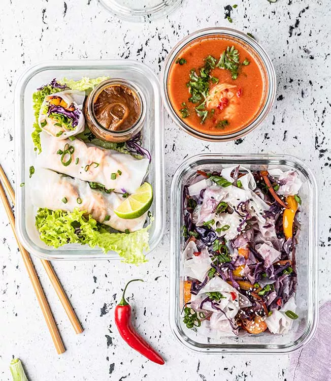 Sommerrollen mit Gemüse, Shrimps und Erdnusssauce